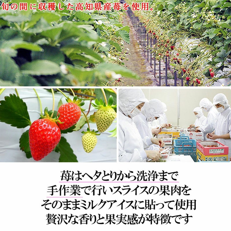 いちごはヘタ取から洗浄まで手作業で行い、スライス果肉をそのままミルクアイスに貼って使用しています。
