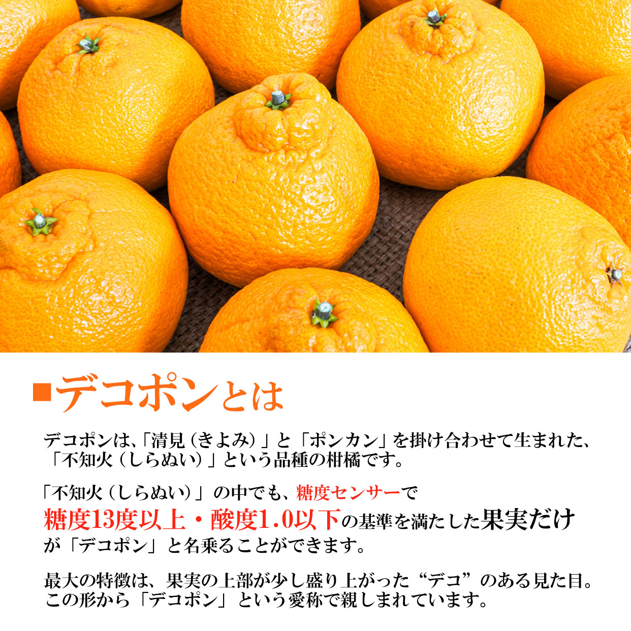 「不知火(しらぬい)」の中でも、糖度センサーで糖度13度以上・酸度1.0以下の基準を満たした果実だけが「デコポン」と名乗ることができます。