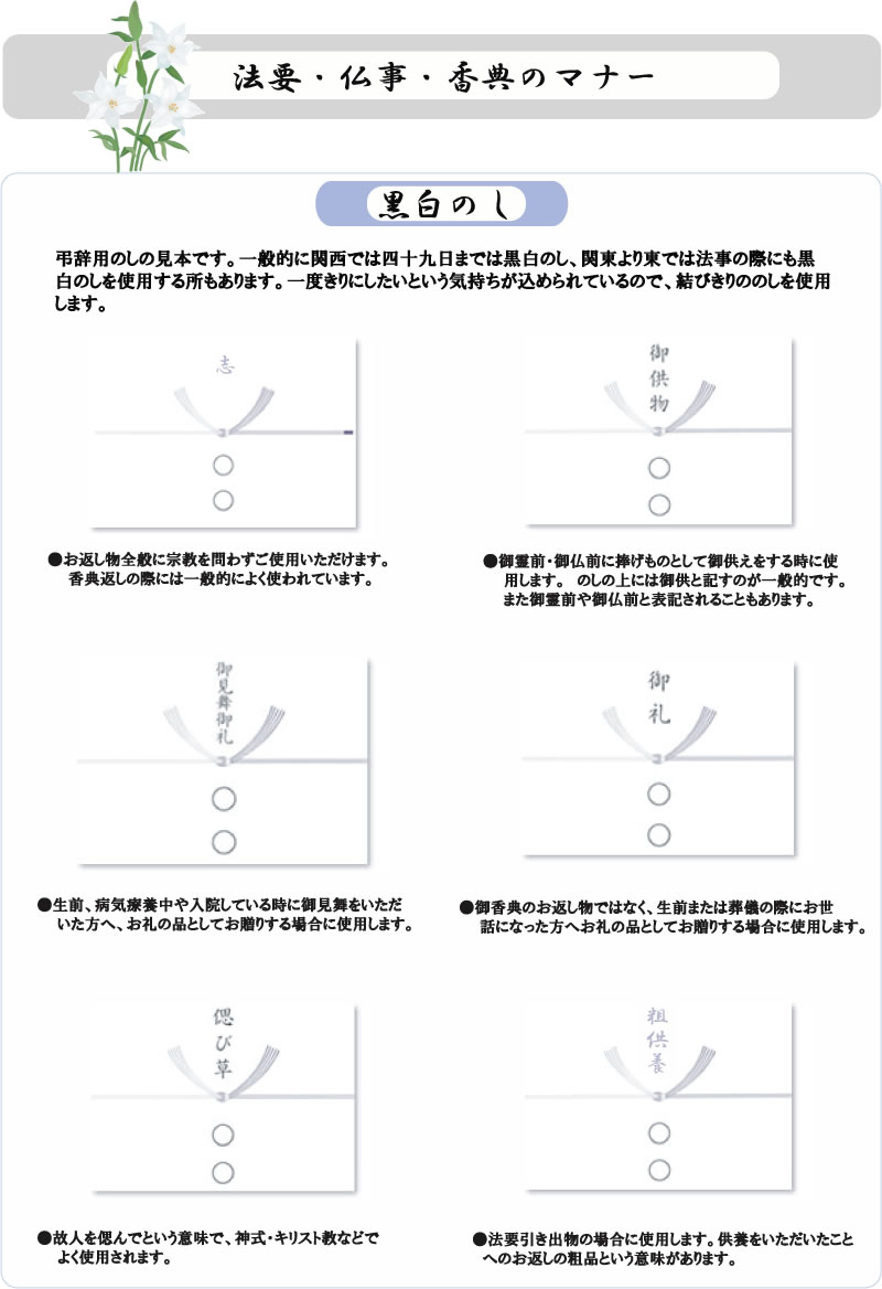 お悔やみごとなど、短冊のしで対応できないものは掛紙のしでご用意致します。 御供のしは地域によって水引の色が違いますので、備考欄に水引の色(黒白もしくは黄白)をご記入ください。 |