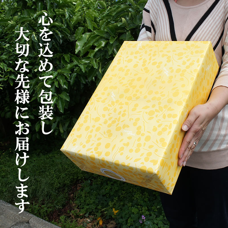 包装、お熨斗のご注文をいただいた場合、白木果樹園オリジナル包装紙でお包みしてのお届けです。 商品箱の大きさによっては簡易包装になります。 包装紙は1種類ですので、お祝いごとにもお悔やみごとにも黄色いオリジナル包装紙でのご用意となります。 |