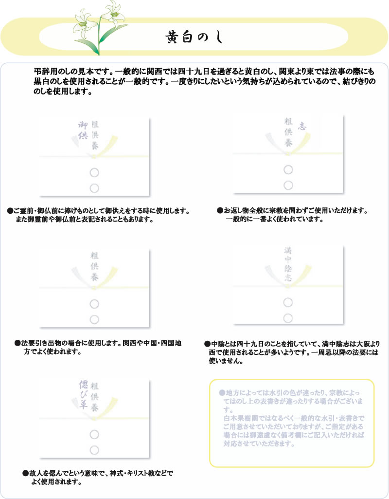 お悔やみごとなど、短冊のしで対応できないものは掛紙のしでご用意致します。 御供のしは地域によって水引の色が違いますので、備考欄に水引の色(黒白もしくは黄白)をご記入下さい。 |