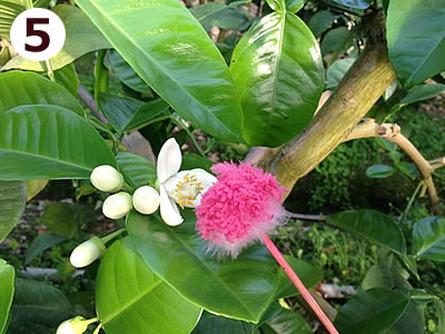 3月 ハウスの中では、水晶文旦と温室土佐文旦の受粉交配作業が行われます。 ブンタンに付ける花粉は小夏の花粉を利用してます。 小夏の花蕾の明日咲くという開いていない蕾を、ひとつひとつ気が遠くなる様な数を取り、黄色の葯だけ採りだします。 文旦類は、自分の花粉では受粉しにくい特質があり、他の柑橘類(小夏や八朔)などの花粉を付ける必要があります。 耳かきの反対側にある梵天という羽毛の部分を使い、受粉交配作業をしていきます。 ひとつひとつの花の雌しべに付ける作業は、根気のいる作業です。 この時期は、土佐文旦の出荷作業や剪定作業も行いながらですので、ネコの手も借りたいほどの忙しさです。 |